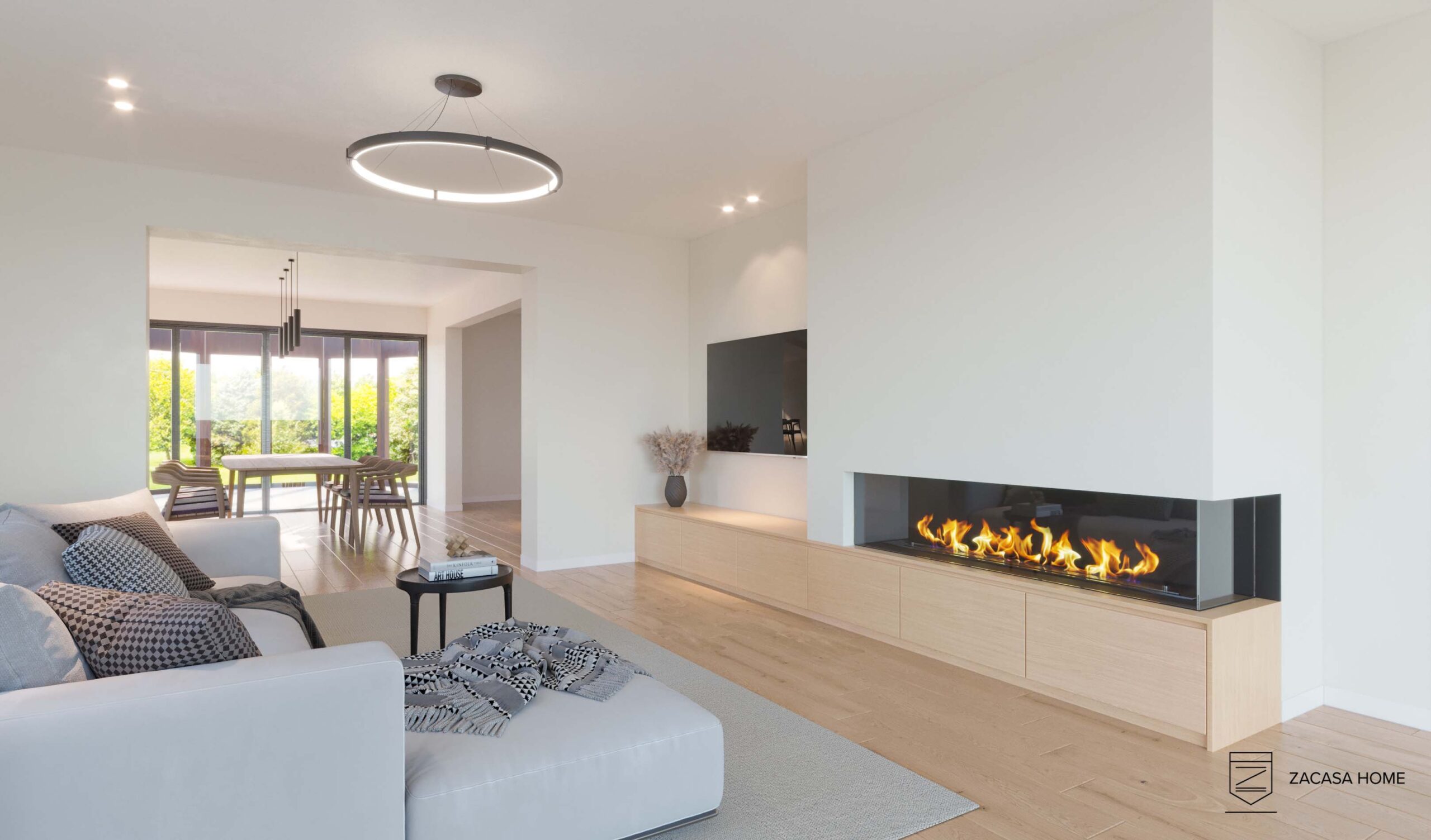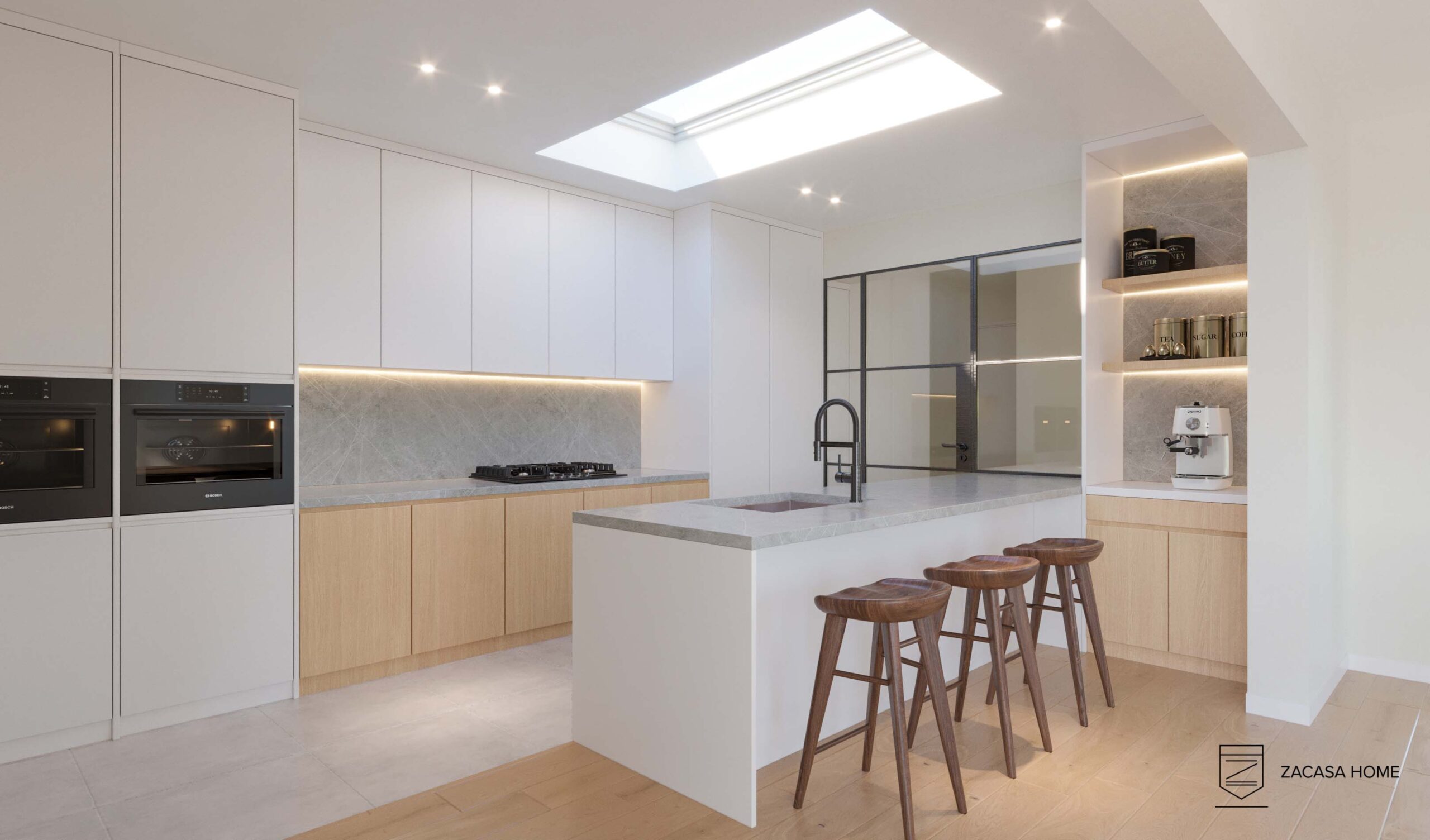 De visualisaties geven een beeld weer van een van de mogelijkheden van deze prachtige woning. Hier is een open keuken aanwezig, die aanpaalt aan de eetplaats, grote leefruimte en extra polyvalente ruimte (die mee geïntegreerd kan worden in de inkomhal). De keuken geeft toegang tot de kelder, alsook een extra berging. In de inkomhal kan een gastentoilet geïnstalleerd worden.  De 2e verdieping is hier voorzien van 2 badkamers, 2 slaapkamers en een vaste trap naar de 2e verdieping, deze is op zijn beurt voorzien van 2 volwaardige slaapkamers.